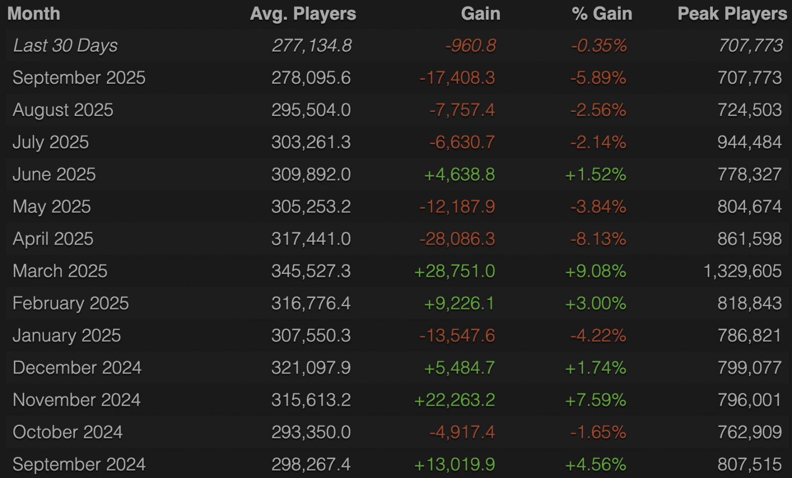 Peak concurrent players in September reached 707,000 — down 17,000 from the previous month, according to data from Steam Charts.