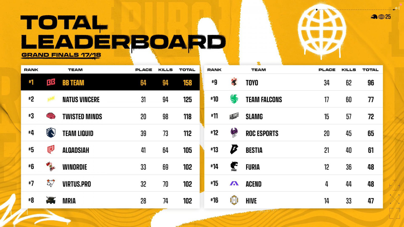 BB Team claimed first place in the final standings, with Twisted Minds finishing second and Natus Vincere taking third. Team Liquid placed fourth, while Al Qadsiah secured fifth.