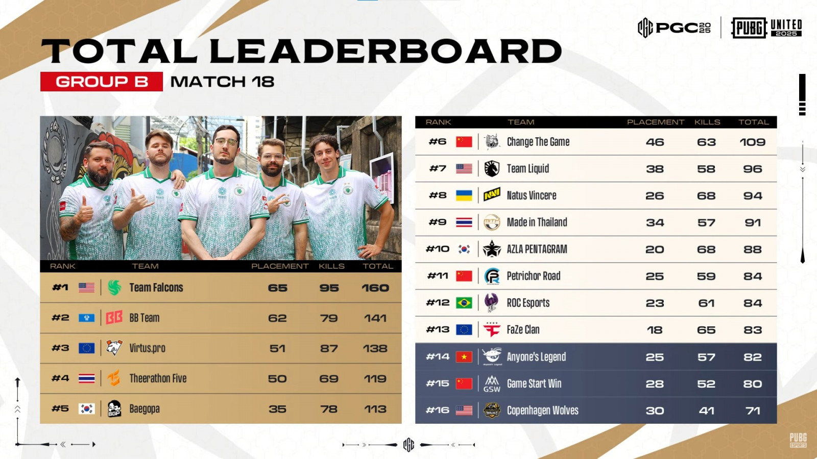 Team Falcons secured first place in the standings with 160 points. BB Team followed with 141 points, and Virtus.pro rounded out the top three with 138 points. Theerathon Five finished in fourth place, while Baegopa took fifth.