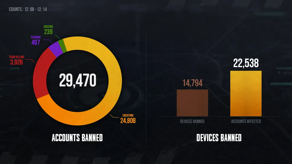 In addition to bans for cheating, 3,926 accounts faced penalties for team killing, 497 for teaming, and 239 for abusive behavior. The total number of banned accounts represents 5% increase compared to the previous week's figures from December 1 – December 7.
