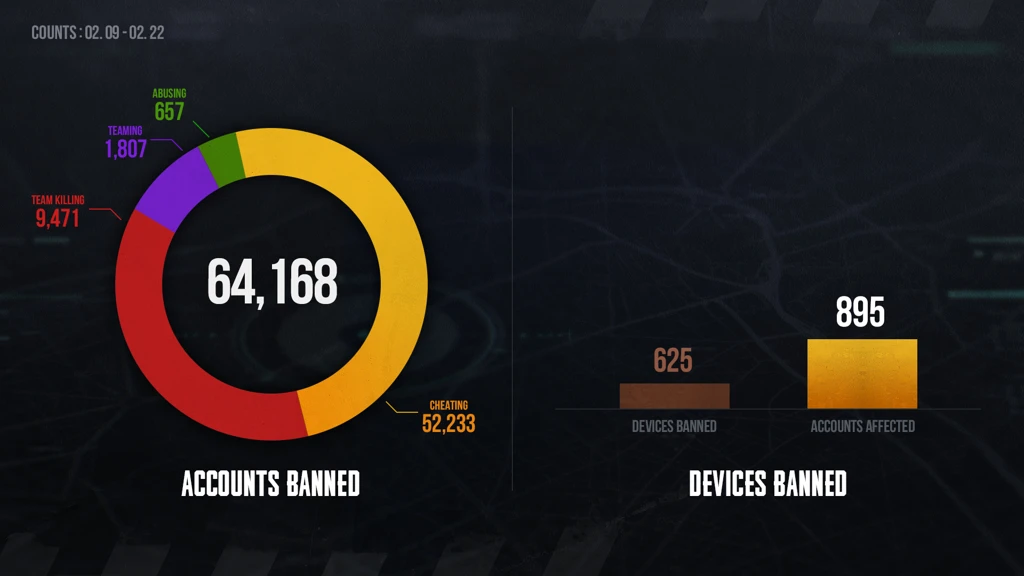 In addition to bans for cheating, 9,471 accounts faced penalties for team killing, 1,807 for teaming, and 657 for abusive behavior. The total number of banned accounts represents 317% increase compared to the previous week's figures from February 2 – February 8.