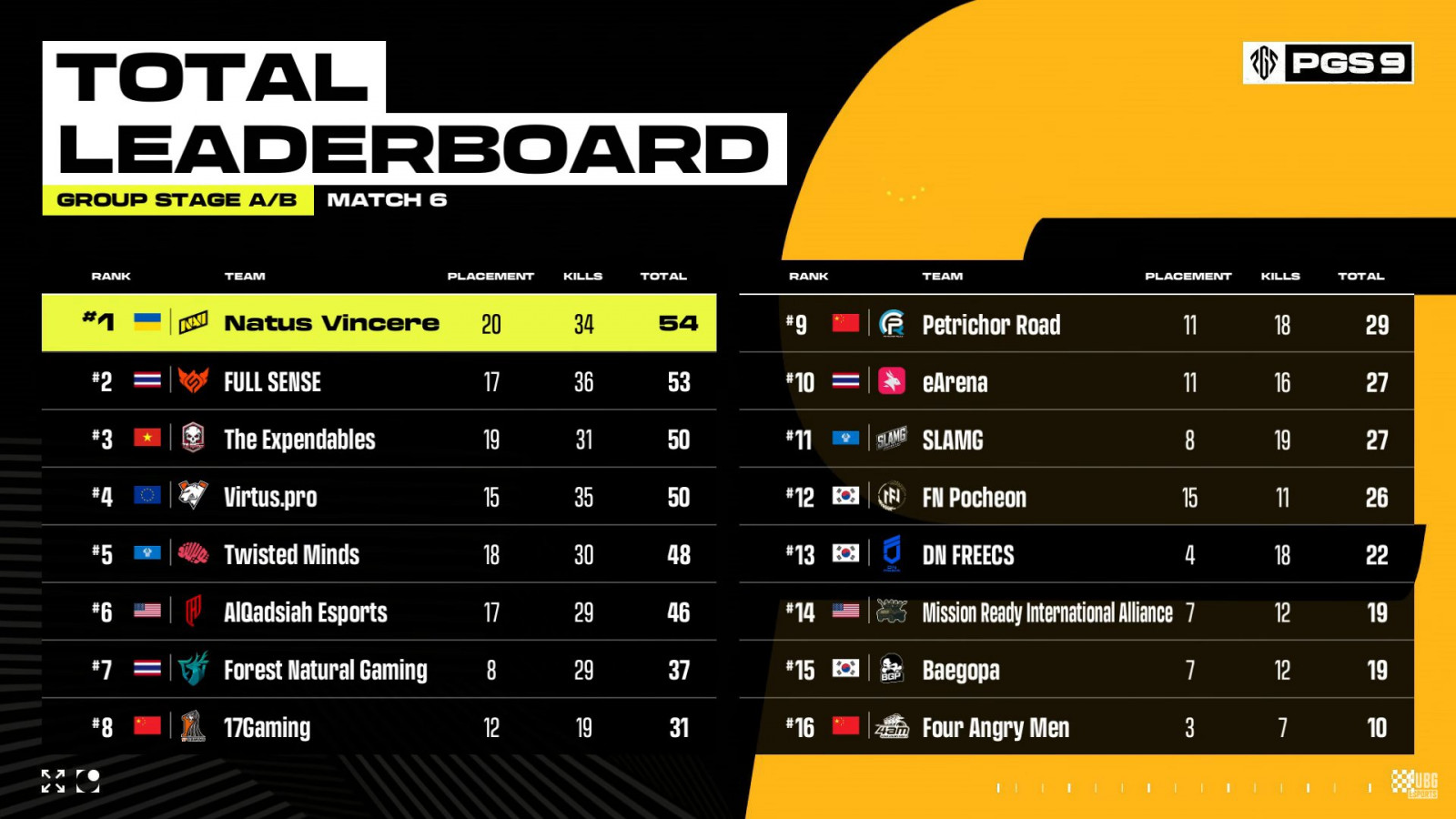 NAVI secured 34 kills and 54 total points over six matches. Full Sense and The Expendables followed in second and third place, respectively. Virtus.pro currently sits fourth, while Twisted Minds holds fifth.