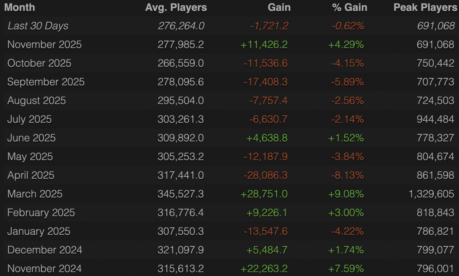 In November, the average player count in PUBG: BATTLEGROUNDS increased by more than four percent compared to October 2025, once again surpassing the 270,000 mark.