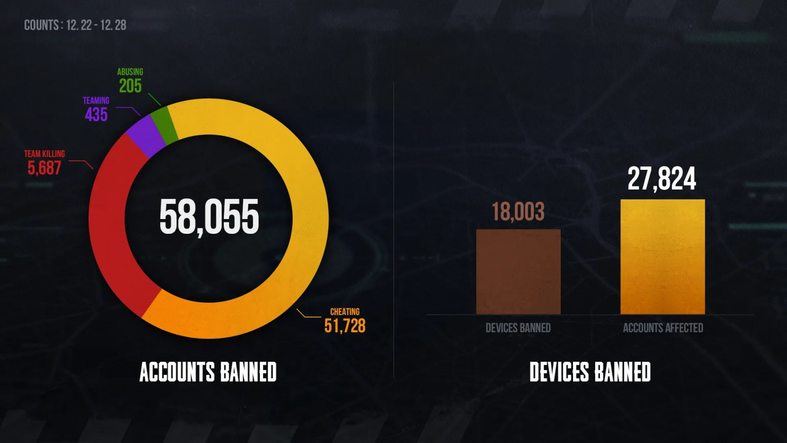 In addition to bans for cheating, 5,687 accounts faced penalties for team killing, 435 for teaming, and 205 for abusive behavior. The total number of banned accounts represents 208% increase compared to the previous week's figures from December 15 – December 21.