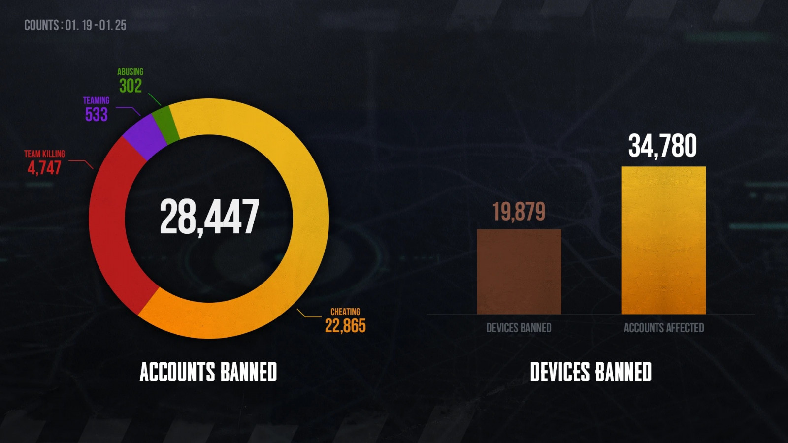 In addition to bans for cheating, 4,747 accounts faced penalties for team killing, 533 for teaming, and 302 for abusive behavior. The total number of banned accounts represents 19% increase compared to the previous week's figures from January 12 – January 18.