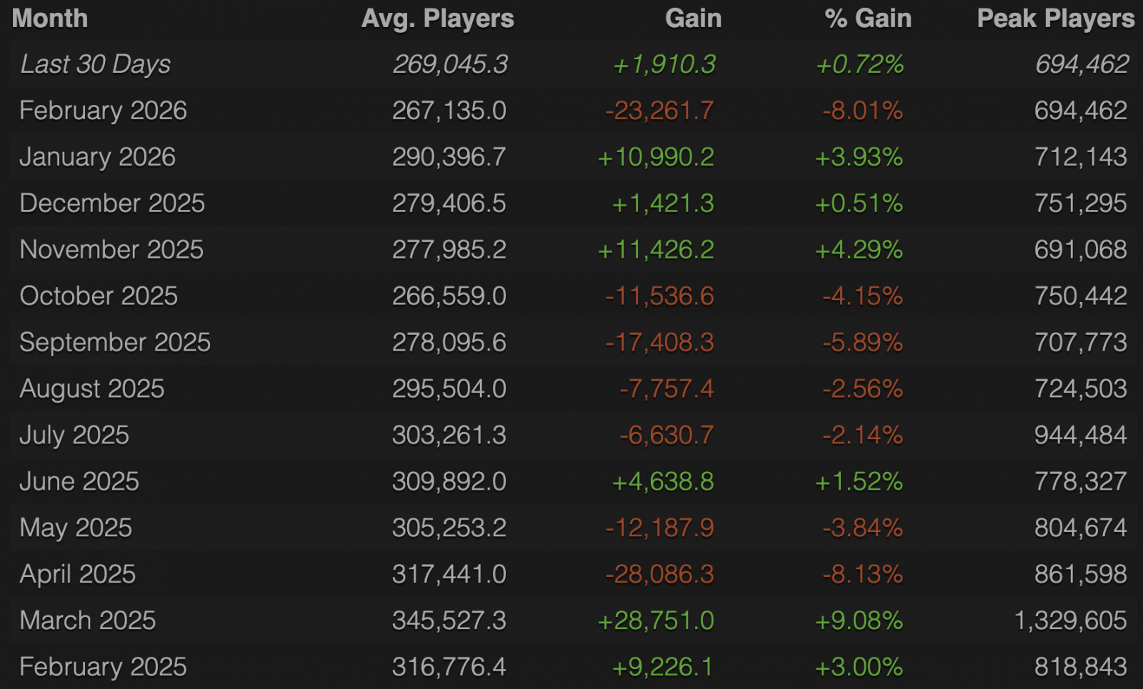 In February, the average online player count in PUBG: BATTLEGROUNDS decreased by eight percent compared to January 2026. As a result, the game’s average monthly audience once again fell below the 270,000 mark.