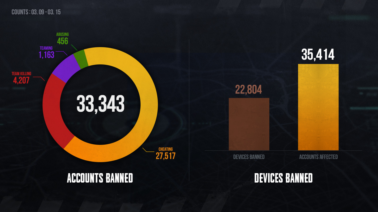In addition to bans for cheating, 4,207 accounts faced penalties for team killing, 1,163 for teaming, and 456 for abusive behavior. The total number of banned accounts represents 21% decrease compared to the previous week's figures from March 2 – March 8.