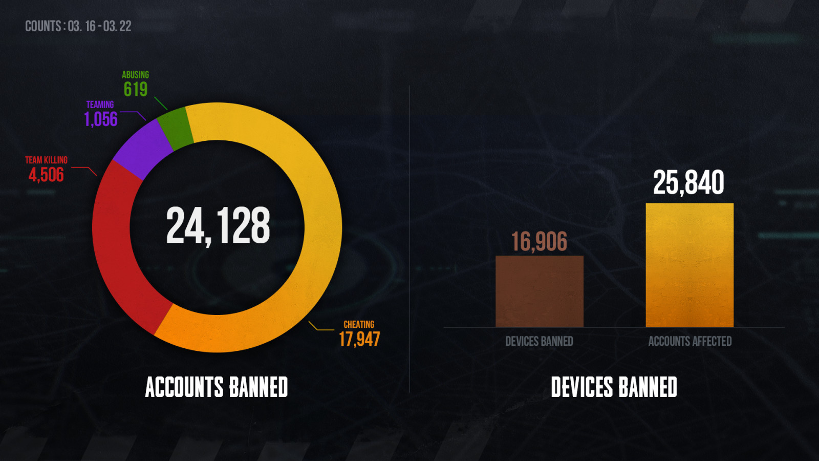 In addition to bans for cheating, 4,506 accounts faced penalties for team killing, 1,056 for teaming, and 619 for abusive behavior. The total number of banned accounts represents 28% decrease compared to the previous week's figures from March 9 – March 15.