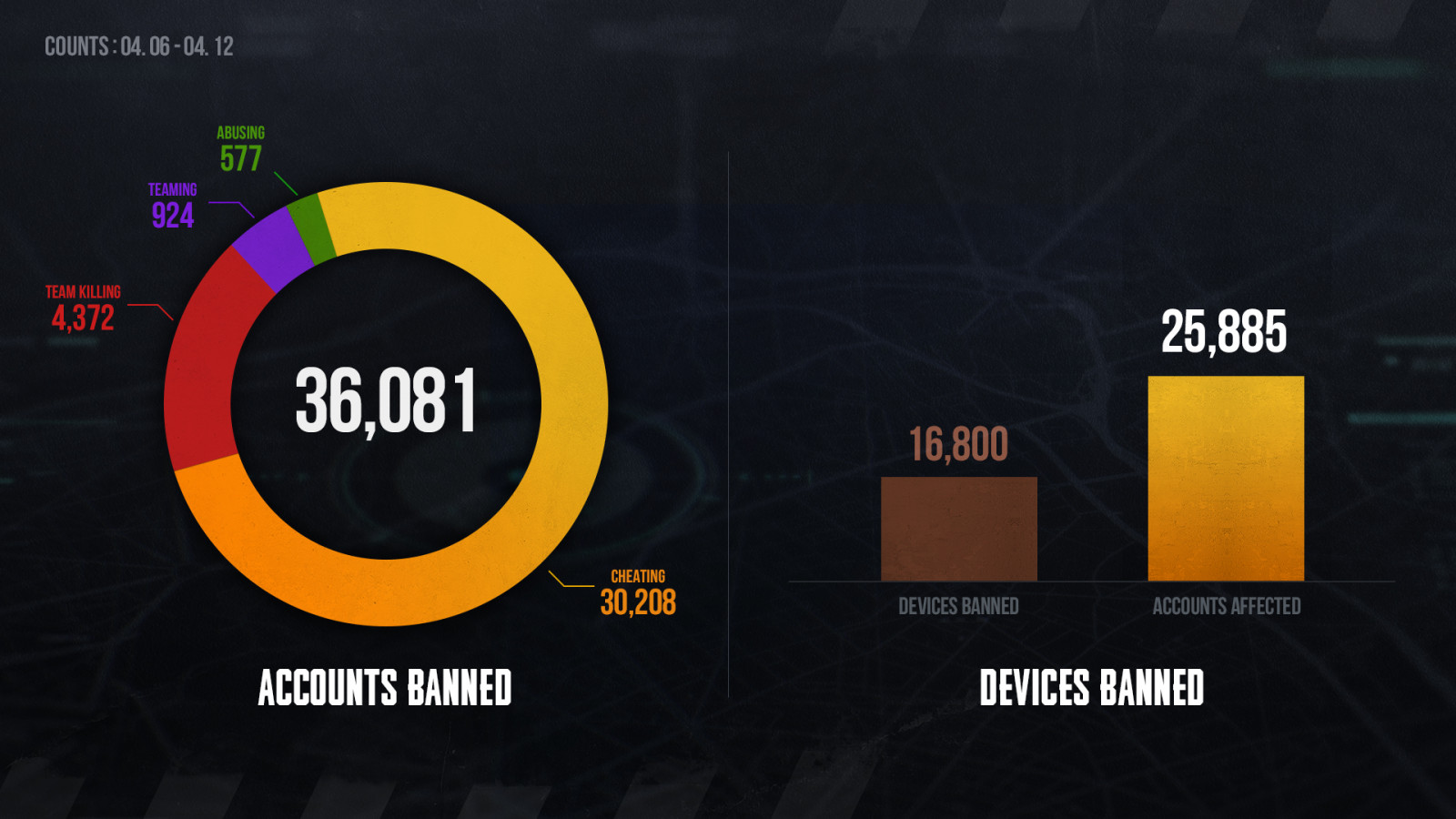 In addition to bans for cheating, 4,372 accounts faced penalties for team killing, 924 for teaming, and 577 for abusive behavior. The total number of banned accounts represents 245% increase compared to the previous week's figures from March 30 – April 5.