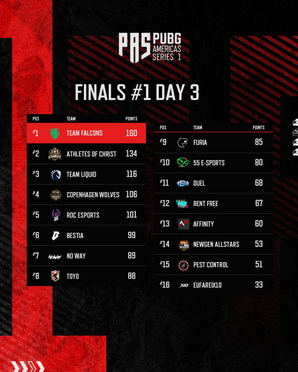 Team Falcons claimed victory in the first grand final of PUBG Americas Series 1 (PAS 1) 2026, an online tournament for PUBG: BATTLEGROUNDS. The team earned $10,000 and 250 PGC points.