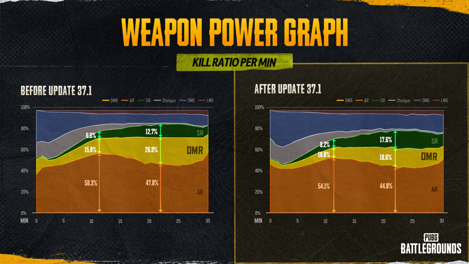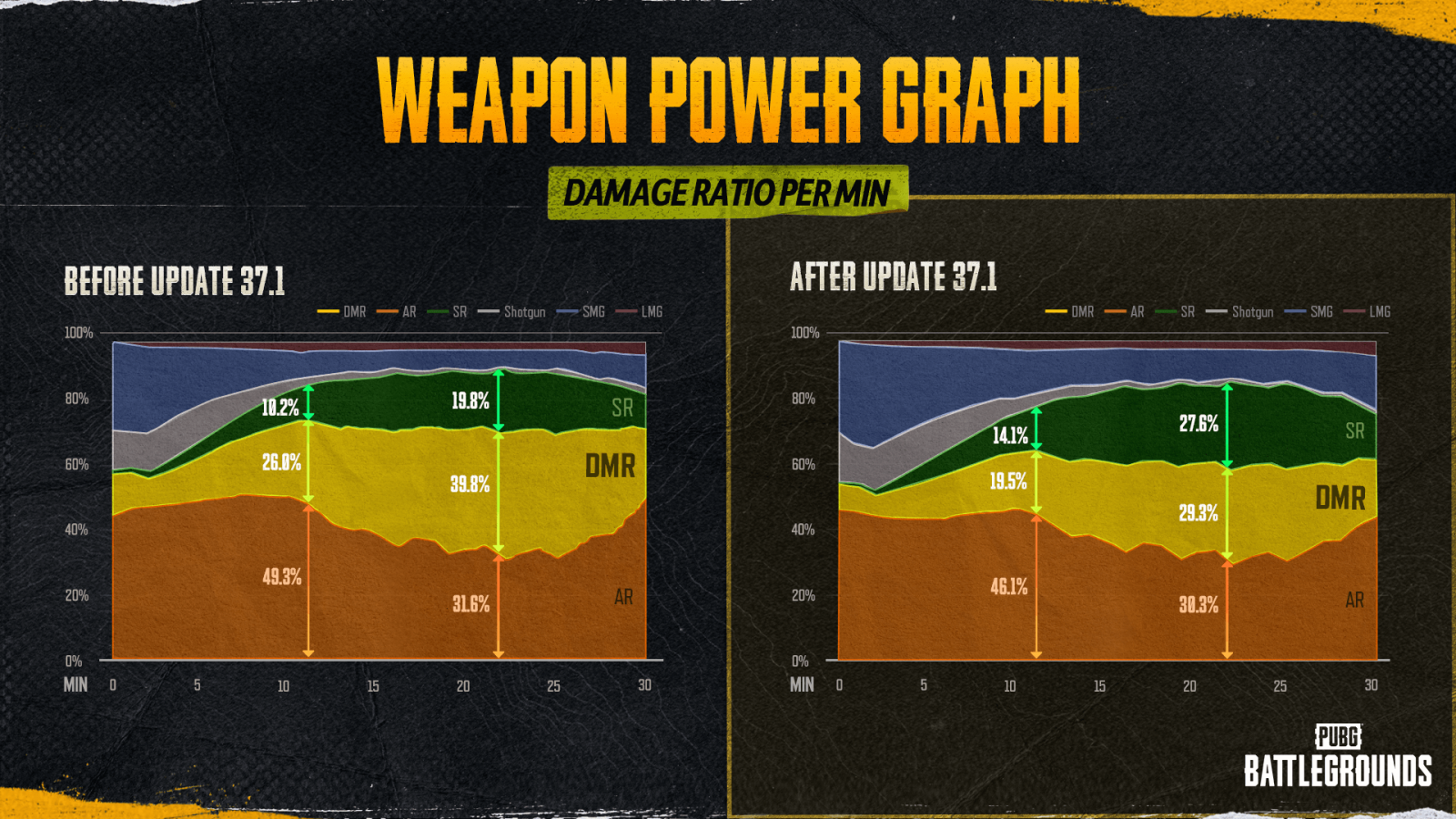 Графики процента урона, наносимого в минуту, демонстрируют аналогичную тенденцию. До изменения баланса МВ проценты урона на среднем и позднем этапах игры для штурмовых винтовок (далее — ШВ), МВ и СВ составляли 31,6%, 39,8% и 19,8%, соответственно, т. е. МВ наносили вдвое больше урона, чем СВ. Однако после обновления эти проценты изменились: 30,3% для ШВ, 29,3% для МВ, 27,6% для СВ, — что указывает на гораздо более равномерное распределение. Таким образом, МВ больше не доминируют по показателю урона на среднем и позднем этапах игры.
