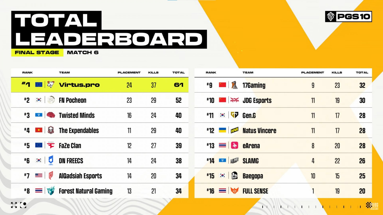 Коллектив Virtus.pro занял первую строчку турнирной таблицы PUBG Global Series 10 по итогам первого игрового дня гранд-финала – сегодня участники отыграли первые шесть матчей.