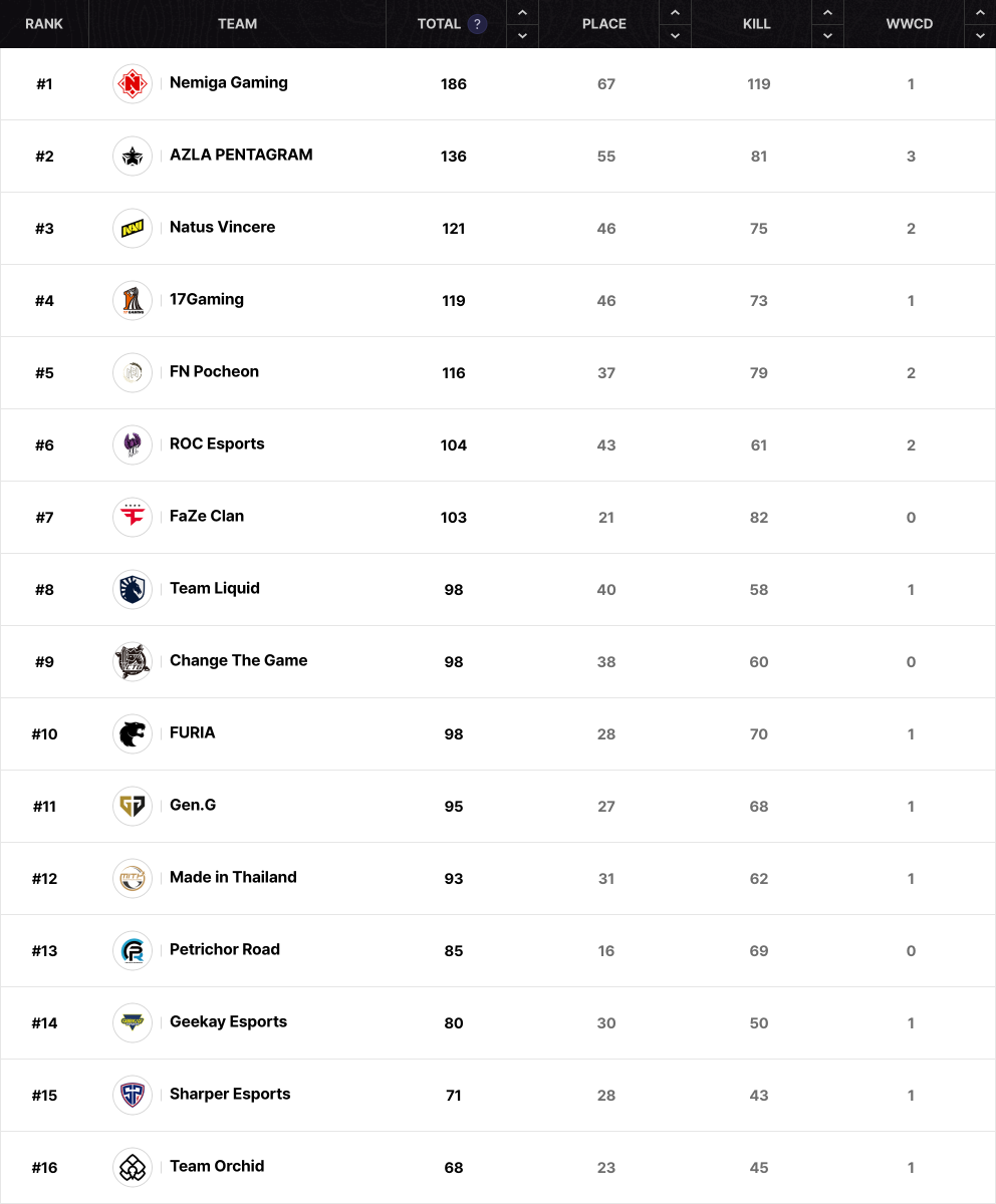 В результате коллектив Nemiga Gaming сохранил за собой первую строчку турнирной таблицы со 186 очками. PENTAGRAM и Natus Vincere вошли в первую тройку со 136 и 121 очками соответственно. FaZe Clan заняла седьмую строчку, Team Liquid – восьмую, а Geekay Esports – 14-ю. Пять лучших команд Last Stage попали в гранд-финал.