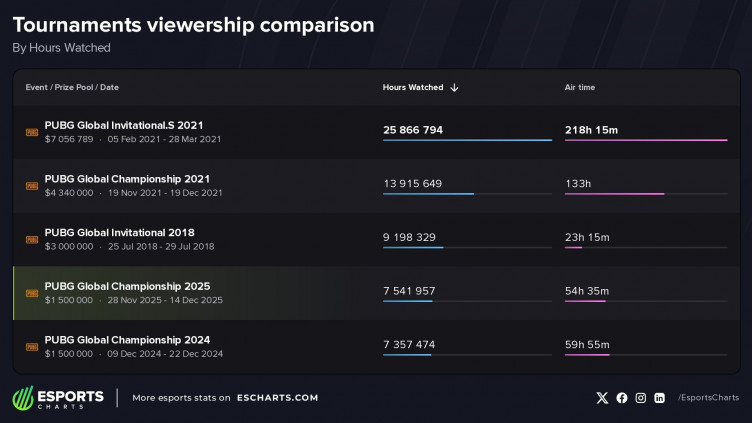 Пи пиковому количеству зрителей PUBG Global Championship 2025 занял шестое место в рейтинге самых популярных турниров по PUBG за всю историю дисциплины.
