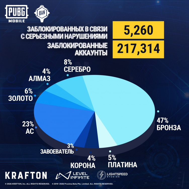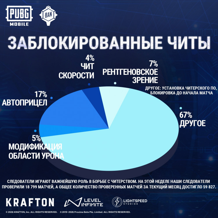 Разработчики мобильной версии PUBG забанили 217 тысяч аккаунтов читеров (и более 5 тысяч устройств) за период с 13 по 19 марта 2026 года.
