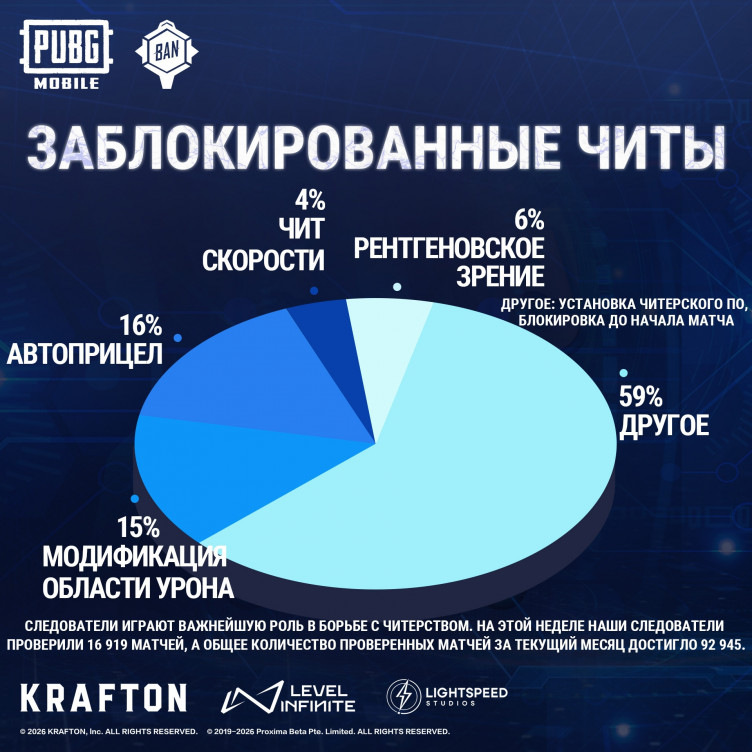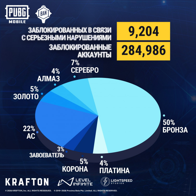Разработчики мобильной версии PUBG забанили 284 тысячи аккаунтов читеров (и более 9 тысяч устройств) за период с 27 марта по 2 апреля 2026 года.